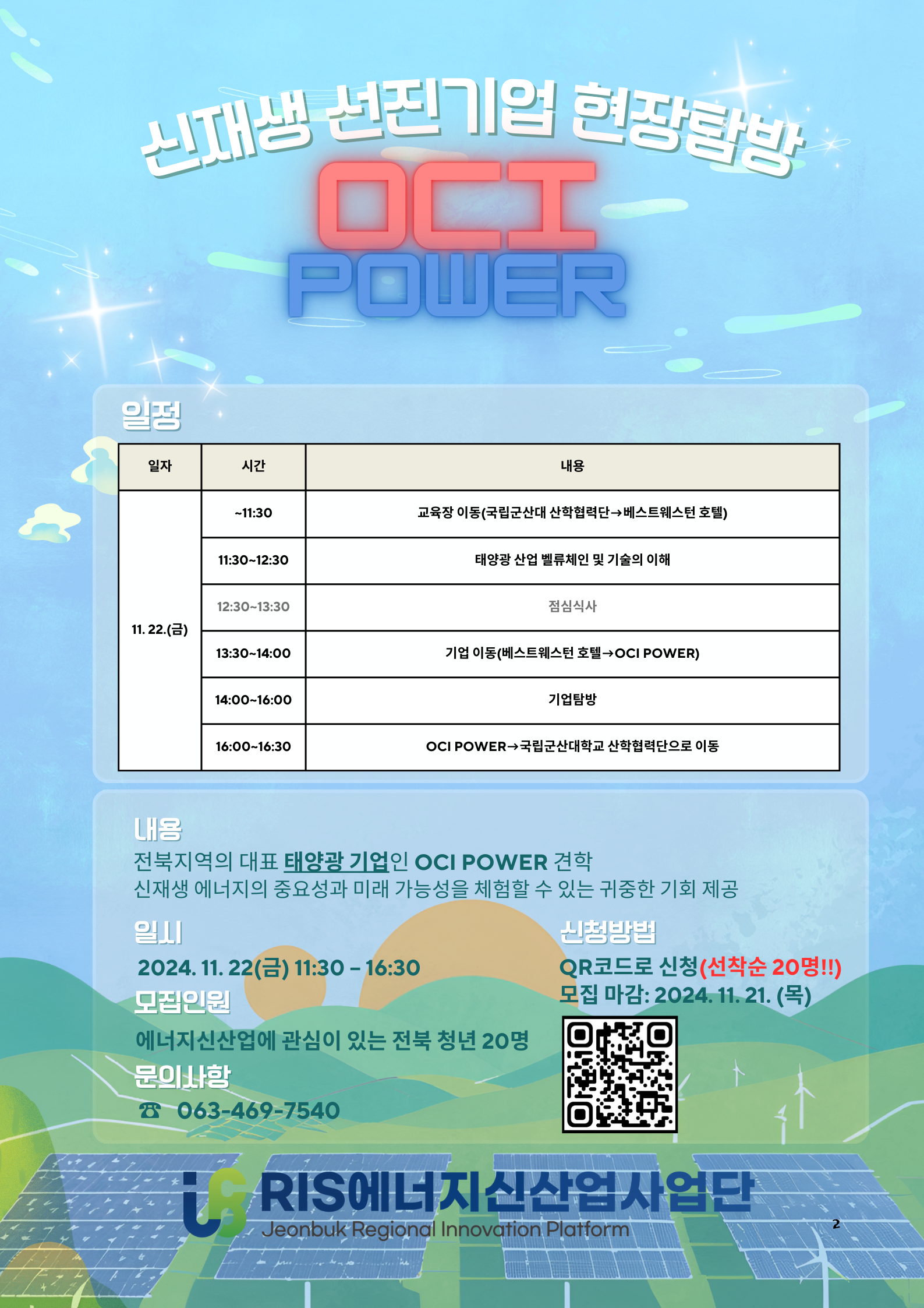 전북지역의 대표 태양광기업인 OCI POWER를 견학하며, 신재생 에너지의 중요성과 미래 가능성을 체험할 수 있는 귀중한 기회를 제공합니다.